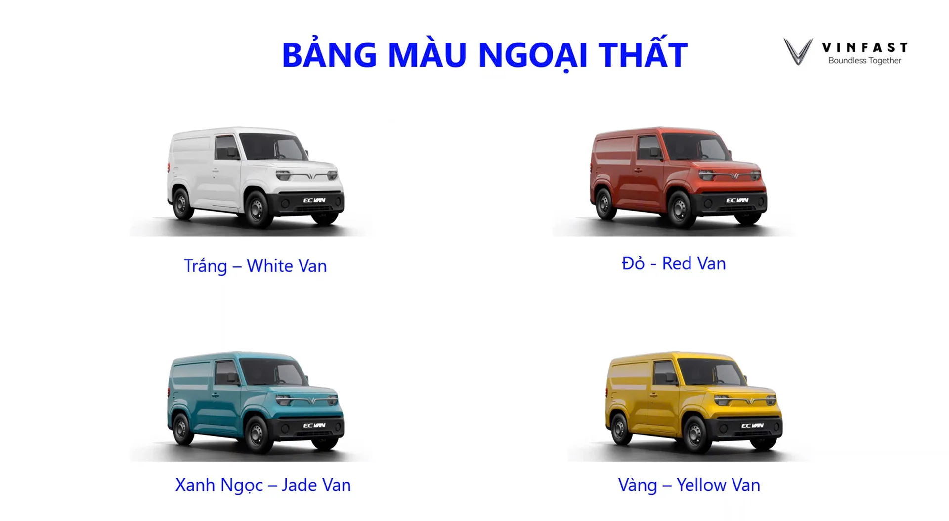 VinFast EC Van (viết tắt từ E-City Van - xe tải điện đô thị) có thiết kế nhỏ gọn, với kích thước các chiều Dài x Rộng x Cao lần lượt là 3.767 x 1.680 x 1.790 (mm), chiều dài cơ sở 2.520 mm, phù hợp với mọi không gian và điều kiện đường sá từ thành thị đến nông thôn. Xe có thiết kế khoang lái 2 chỗ ngồi cùng khoang hành lý phía sau với dung tích chứa hàng lên tới 2.600L, tải trọng trên 600 kg.